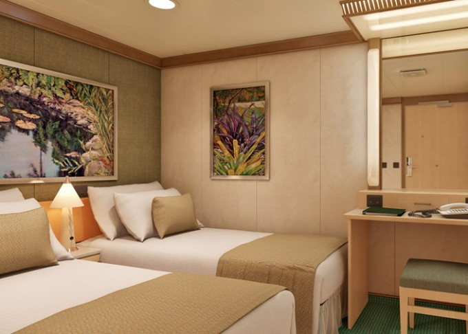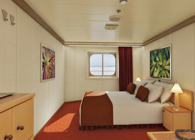Základní vybavení všech kajut: koupelna se sprchou a WC, TV s plochou obrazovkou, telefon, elektrická zásuvka 110 AC, regulovatelná klimatizace, postele Carnival Comfort, vysoušeč vlasů, trezor.