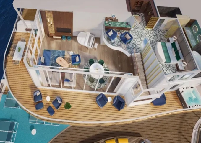 OS - Owner’s Suite 61 m² + 17,5 m² balkón s výhledem na moře. 16,17. paluba vpředu. Max 5 osôb. Výhody Royal Suite Sky class. 451 137 Kč 225 568 Kč za osobu