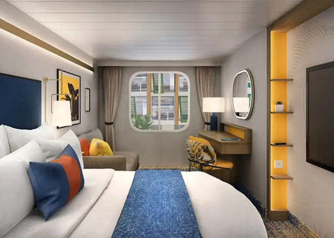 T5 - Vnitřní kajuta s oknem / Surfside Family 17 m². Neotevíratelné okno s výhledem na čtvrť Surfside. 8. paluba vpředu. Max 4 osoby. 87 842 Kč 43 921 Kč za osobu