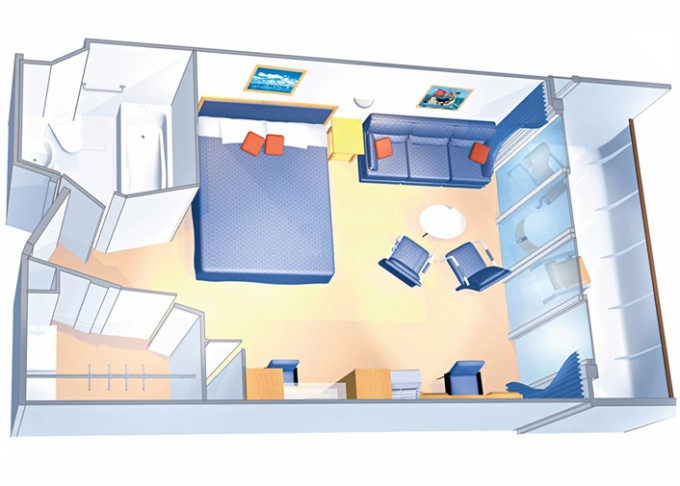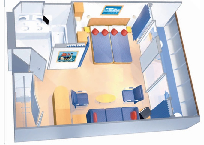 1K - Velká vnější kajuta Ultra Spacious 24,5 m². Neotevíratelné okno. 7/8. paluba. Max. 6 osob. 115 603 Kč 38 534 Kč za osobu