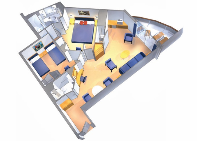OT - Owner´s Suite s balkonem / 2 ložnice 54 m² / balkon 14 m². Výhody Royal Suite Class. 7/8/9. paluba. Max 8 osob. 303 063 Kč 101 021 Kč za osobu