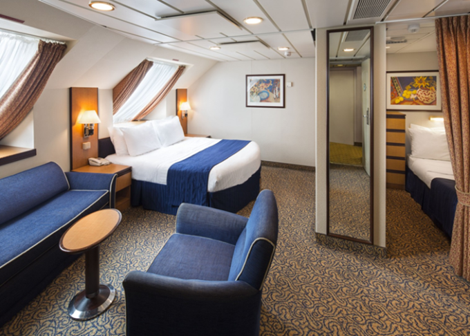 J3 - Junior Suite s balkonem 28 m² / balkon 6 m². Výhody Royal Suite Class. 10. paluba. Max 4 osoby. 170 698 Kč 170 698 Kč za osobu