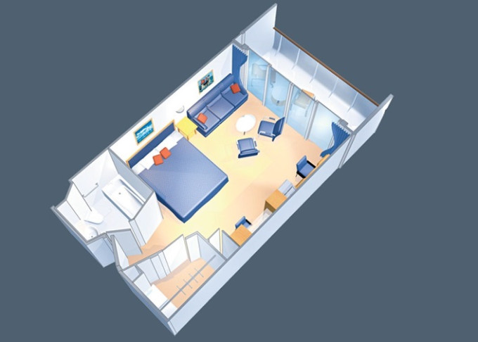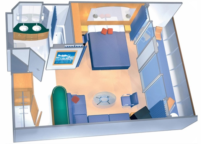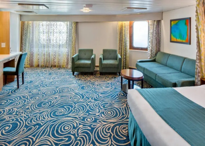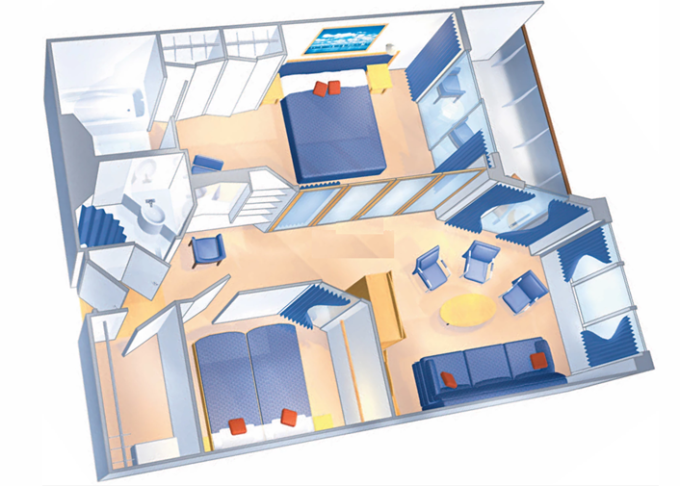VO - Ocean View Suite (bez balkonu) 44 m². Panoramatické neotevíratelné okna. Výhody Royal Suite Class. 8. paluba. Max 6 osob. 183 652 Kč 91 826 Kč za osobu