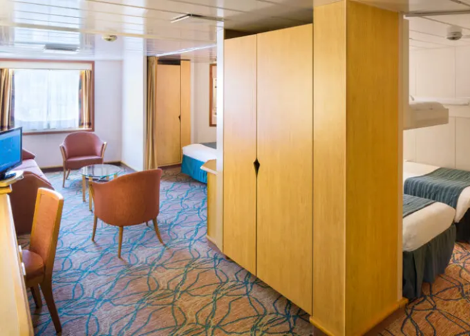 VO - Ocean View Suite (bez balkonu) 44 m². Panoramatické neotevíratelné okna. Výhody Royal Suite Class. 8. paluba. Max 6 osob. 212 189 Kč 70 730 Kč za osobu
