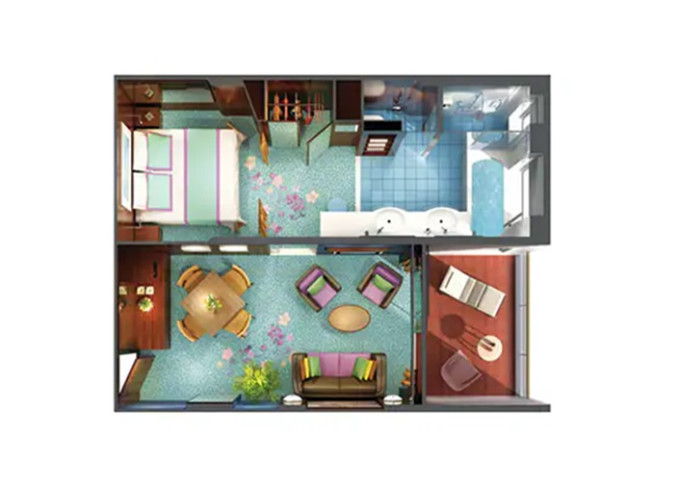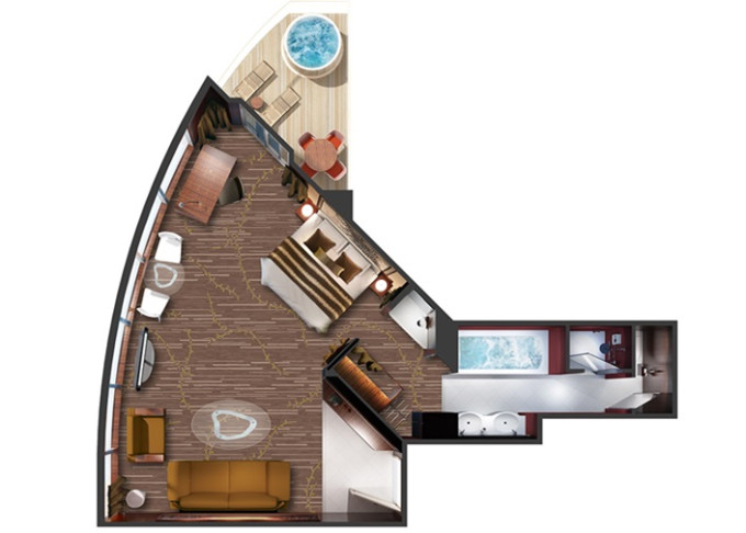 Suite: luxusní varianta ubytování na nejlepších místech na lodi, prostorné a luxusně vybavené; více variant včetně suite v privátní zóně The Haven