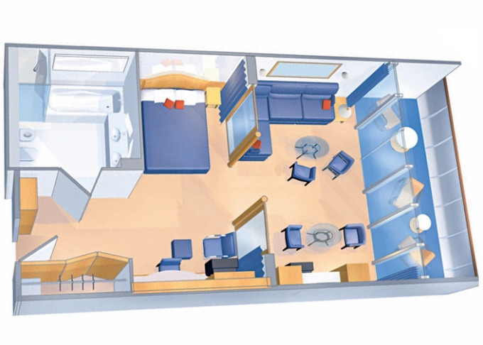 GT - Grand Suite s balkonem / 2 ložnice 49 m² / balkon 7,5 m². Výhody Royal Suite Class. 8. paluba. Max 8 osob. 135 146 Kč 45 049 Kč za osobu