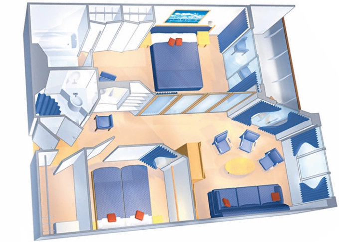 RS - Royal Suite s balkonem 104 m² / balkon 14 m². Výhody Royal Suite Class. Koupelna s vířivkou. 8. paluba. Max 4 osoby. 199 536 Kč 49 884 Kč za osobu