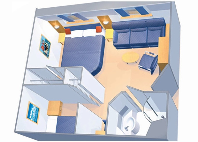 | VP - Ocean View Panoramic Suite (bez balkonu) 37 m². Panoramatické neotevíratelné okna. Výhody Royal Suite Class. 12. paluba. Max 6 osob. | 150 479 Kč 50 160 Kč za osobu |