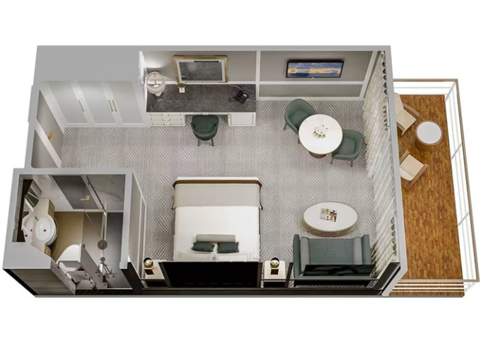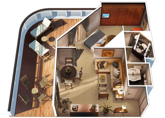 | PH1 - Penthouse Suite 24 m² + balkon 6 m². Výhody Penthouse Suite. 8. paluba. Max 2-3 osoby. Ložnice s obývací částí, koupelna se sprchovým koutem. | 649 871 Kč 324 936 Kč za osobu | ||