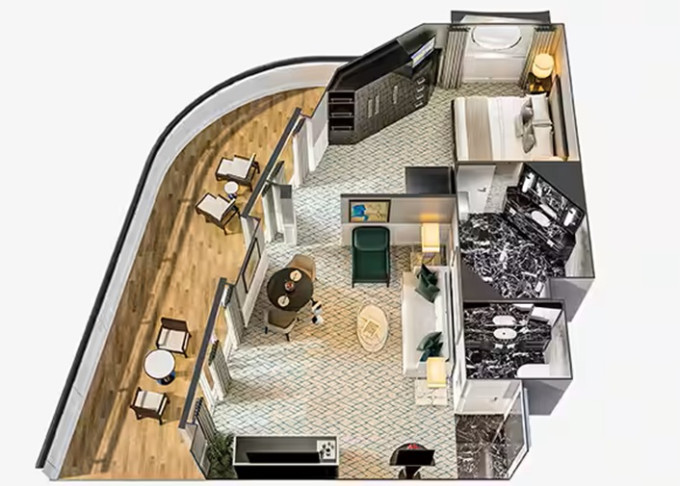 | OS - Owner’s Suite 58 m² + rohový balkon 32 m². Výhody Owners Suite. 6/7/8. paluba vzadu. Max 2-4 osoby. Ložnice, předělená obývací a jídelní část, onyxová koupelna se sprchovým koutem a vířivkou, extra wc. | 1 799 386 Kč 899 693 Kč za osobu |