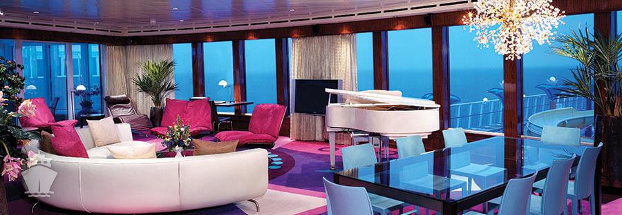 Suite: luxusní varianta ubytování na nejlepších místech na lodi, prostorné a luxusně vybavené; více variant včetně suite v privátní zóně The Haven