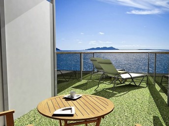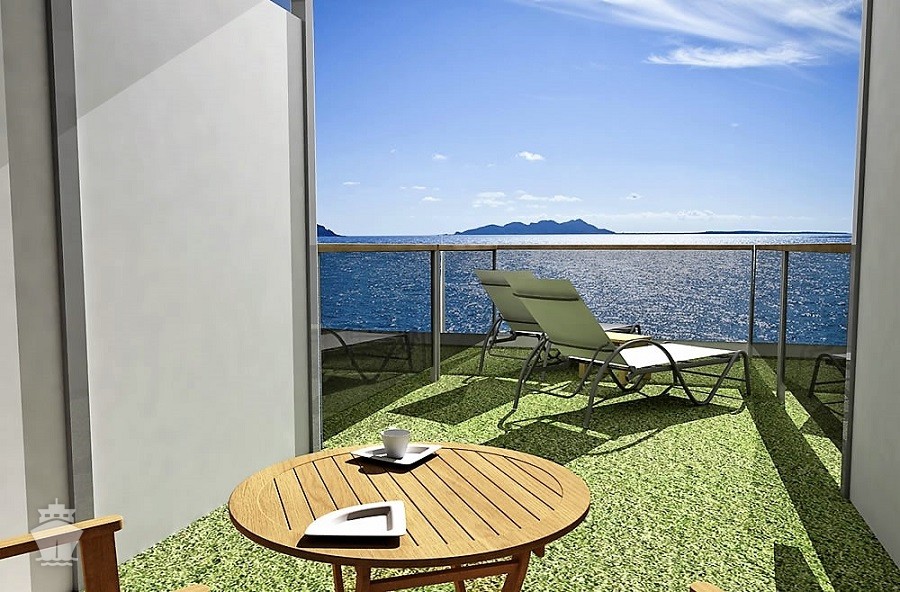 Kajuta s balkónem: 16 -17 m², kajuta s manželskou postelí (na požádání 2 oddělené postele) a rozkládací pohovka. Klimatizace, koupelna se sprchou nebo vanou a WC, toaletní stolek, prostorná skříň, interaktivní TV, telefon, sejf, vysoušeč vlasů. Balkony se stolkem a židlemi. Některé kajuty mají omezený výhled.