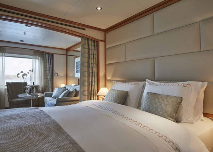 VI - Vista Suite s oknem 27 m². Panoramatické neotevíratelné okno. Ložnice s oddělitelnou obývací částí. 496 085 Kč 248 043 Kč za osobu