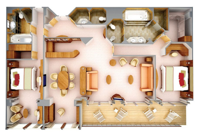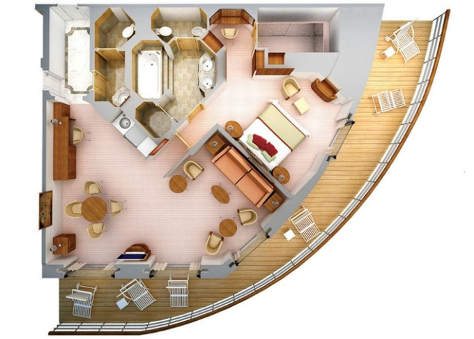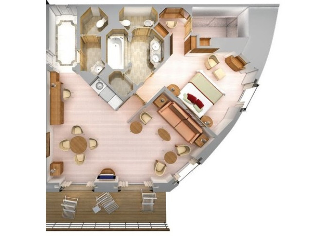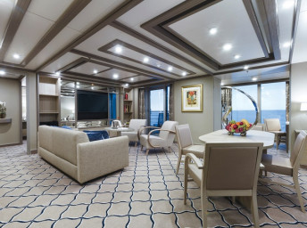| S2 - Silver Suite 2 100 m² (včetně balkona). 2 ložnice, 2 koupelny, oddělená obývací a jídelní část. Horní paluby. | 1 663 639 Kč 831 819 Kč za osobu |