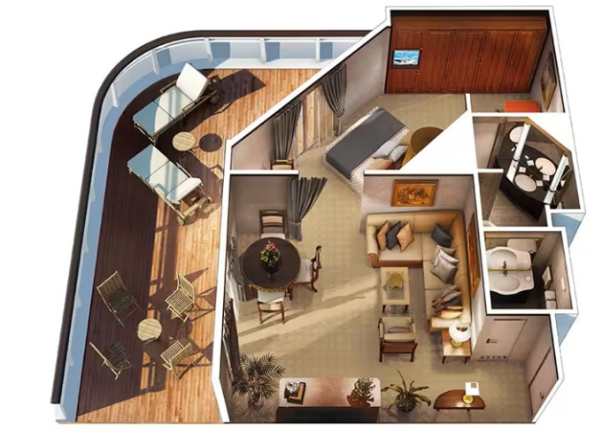 | OS - Owner’s Suite 123 m² + balkon s vířivkou od 62 m². Výhody Owners Suite. 8/9/10. paluba. Max 2-3 osoby. 4 izby: vstupná hala s pianom, ložnice, velká obývací místnost s jídelní částí, 2 koupelny (1 s vířivkou), 2 šatníky. | 1 052 753 Kč 526 376 Kč za osobu |
