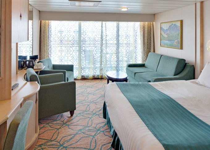 | VO - Ocean View Suite (bez balkonu) 44 m². Panoramatické neotevíratelné okna. Výhody Royal Suite Class. 8. paluba. Max 6 osob. | 77 069 Kč 19 267 Kč za osobu | ||