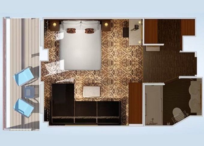 | 7C - Kajuta s balkónem Cca 21 m² ( kajuta i balkón); balkon je částečně chráněný - "cove". | 54 670 Kč 27 335 Kč za osobu | ||