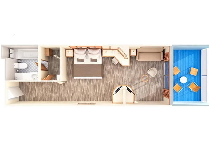 8C - Kajuta s balkonem 21,5 m² (včetně balkonu). 11. a 12. paluba. 43 545 Kč 21 773 Kč za osobu