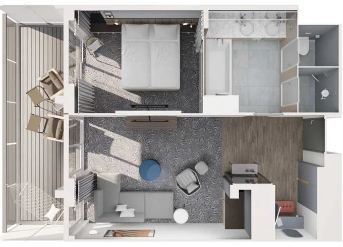 | JKCO - Junior Suite s balkonem C 26 m² + balkon 7 m² se židlemi a podnožkami. 7. paluba. Max 4 osoby. Výhody Junior Suite. | 283 019 Kč 70 755 Kč za osobu |