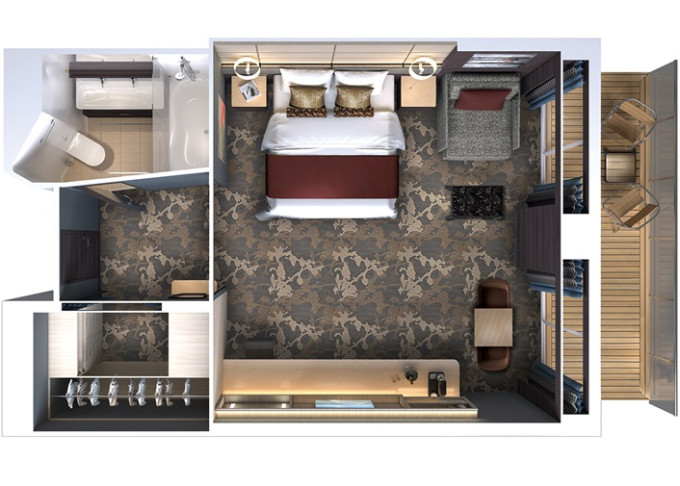 | BB - Kajuta s balkonem od 20 m² / balkon 4-5 m². 10/11/13. paluba. Max 2-4 osoby. | 120 463 Kč 60 232 Kč za osobu | ||
