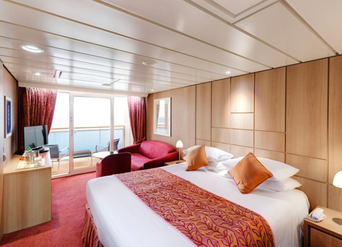 Suite s balkónem: cca 27 m², kajuta s manželskou postelí (na požádání 2 oddělené postele) a rozkládací pohovka. Klimatizace, koupelna s vanou a WC, toaletní stolek, prostorná skříň, interaktivní TV, telefon, minibar, sejf, vysoušeč vlasů. Balkon se stolkem a židlemi.