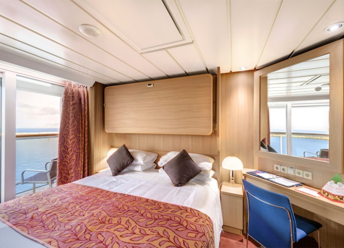 Kajuta s balkónem: 17 m², kajuta s manželskou postelí (na požádání 2 oddělené postele) a rozkládací pohovka. Klimatizace, koupelna se sprchou nebo vanou a WC, toaletní stolek, prostorná skříň, interaktivní TV, telefon, minibar, sejf, vysoušeč vlasů. Balkony se stolkem a židlemi.